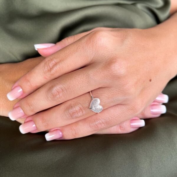 O coração é o destaque principal do anel, representando o amor, a paixão e os sentimentos mais profundos. O formato suave e curvilíneo do coração é acentuado pela filigrana, que adiciona um toque de elegância e sofisticação à peça.