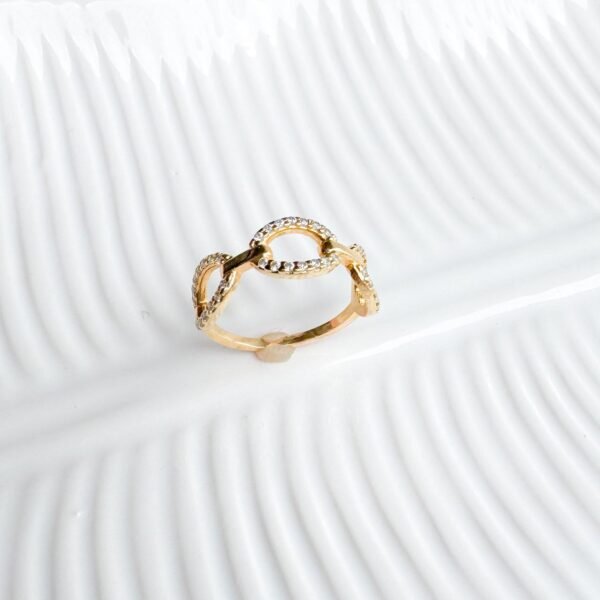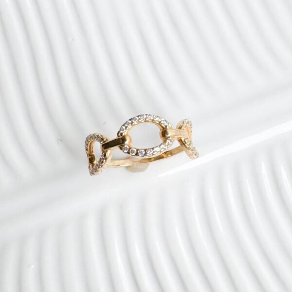 Esse anel tem um design sofisticado e moderno, com elos interligados, sendo um deles cravejado com zircônias. O banho em ouro 18k confere elegância e brilho à peça, tornando-a perfeita para compor looks tanto casuais quanto sofisticados.