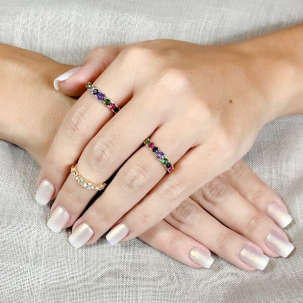 O ANEL Meia Aliança pode ser cravejado em pedras cristais ou coloridas e é uma obra-prima da joalheria que exala elegância e sofisticação. Cada detalhe meticulosamente elaborado reflete a beleza artística e o brilho das pedras.