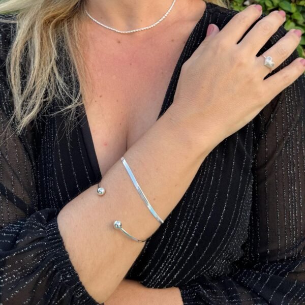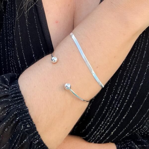 O bracelete Esferas folheado a prata é uma peça de joalheria delicada e elegante. Ele é composto por duas pequenas esferas, que pode ser ajustada ao redor do pulso. O acabamento folheado a prata confere um brilho suave e refinado, refletindo a luz de forma discreta e sofisticada, criando um efeito visual atrativo e dinâmico. Esse tipo de bracelete é versátil, ideal tanto para ocasiões formais quanto para o uso casual, adicionando um toque de glamour ao visual sem exageros.