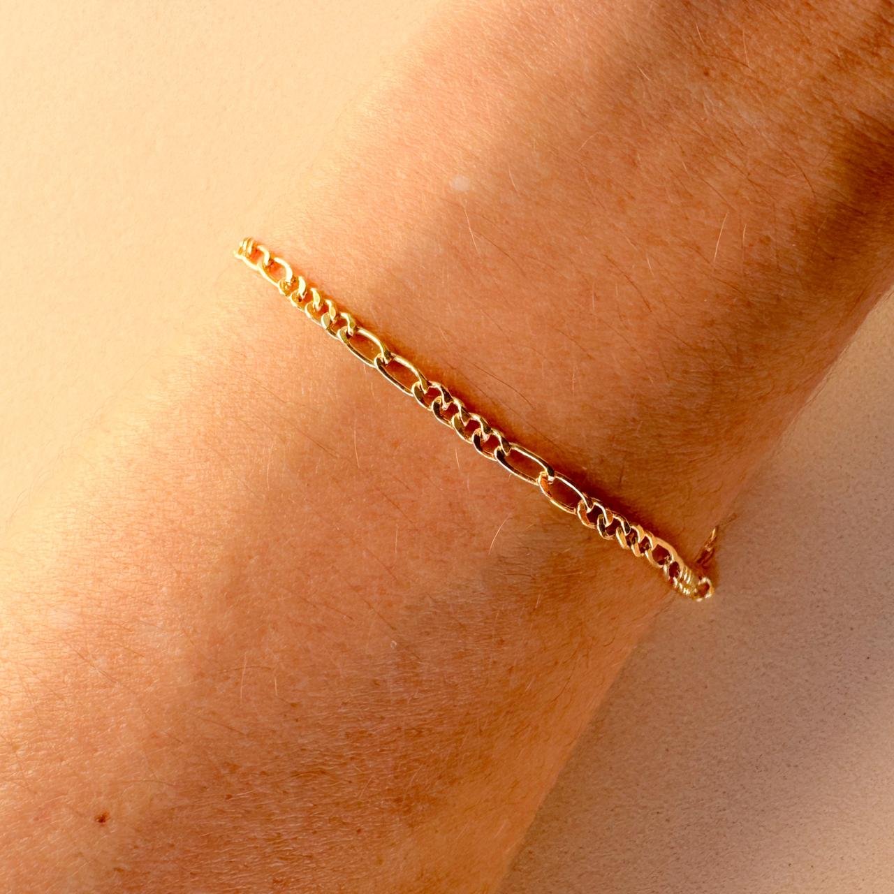 O bracelete é folheado a ouro 18K, garantindo uma aparência de alta qualidade e durabilidade excepcional. Sua camada de ouro protege a peça contra o desgaste do dia a dia, mantendo seu brilho inigualável.