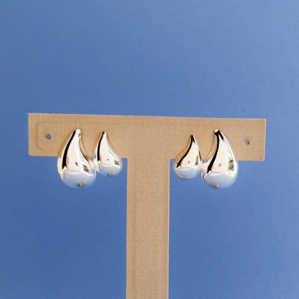 Nesse modelo, você encontra duas peças distintas, que podem ser usadas juntas ou separadas, dependendo do estilo e da ocasião. Cada peça tem o formato de gota e é folheada a prata, garantindo brilho e sofisticação. Uma gota pode ser ligeiramente maior ou mais longa que a outra, criando um efeito visual de simetria ou assimetria, mas sempre com um toque de elegância.