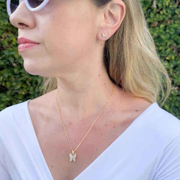 O conjunto borboletas folheado a ouro 18k, composto por brincos e colar, cravejados em micro zircônias é uma expressão de delicadeza e elegância. O colar apresenta um pingente em forma de borboleta, com traços finos e detalhados, capturando a beleza e a leveza do inseto de forma sofisticada. Os brincos seguem o mesmo design, complementando o colar de maneira harmoniosa e criando um visual coeso e encantador.