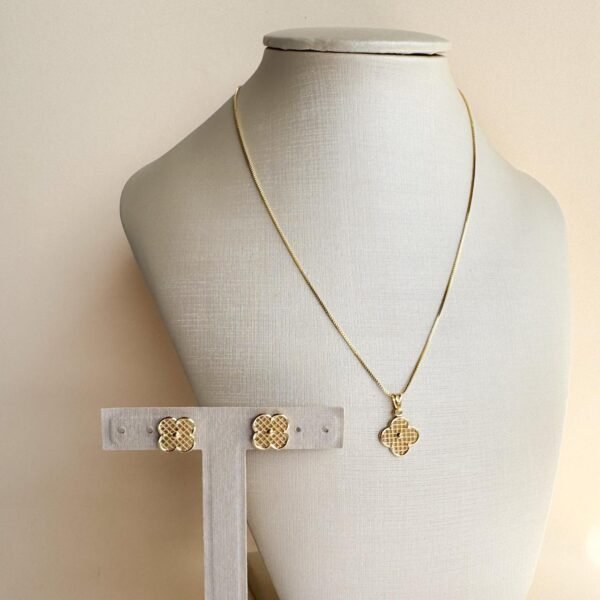 Esse Conjunto modelo trevo de quatro folhas, conta com um design de trama vazada. Ele é folheado a ouro, proporcionando um brilho sofisticado e elegante. O formato de trevo combina com a tendência de peças que trazem sorte e simbolismo, ideal para quem busca um acessório delicado e estiloso para o dia a dia ou ocasiões especiais.