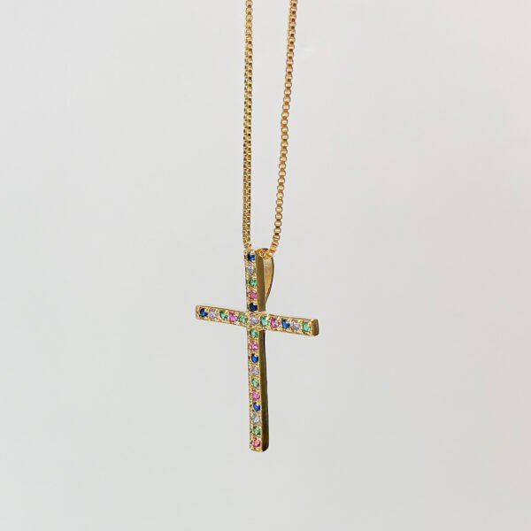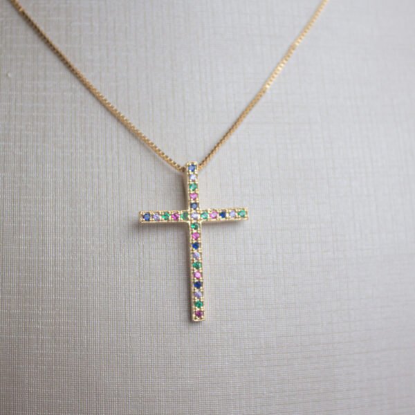 Gargantilha crucifixo folheado a ouro 18k com micro cravações de zircônias.