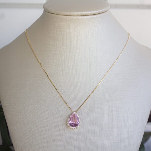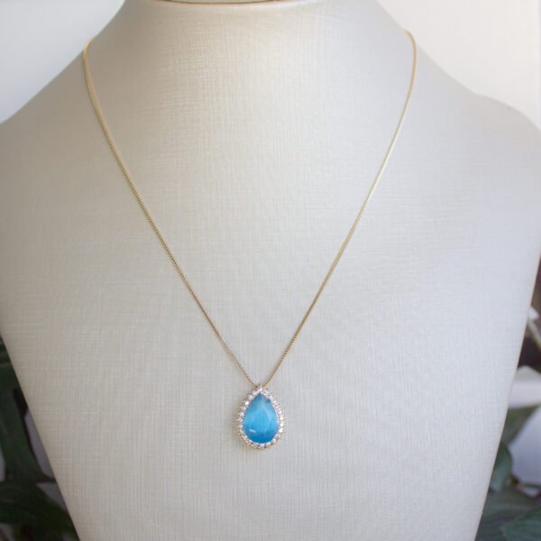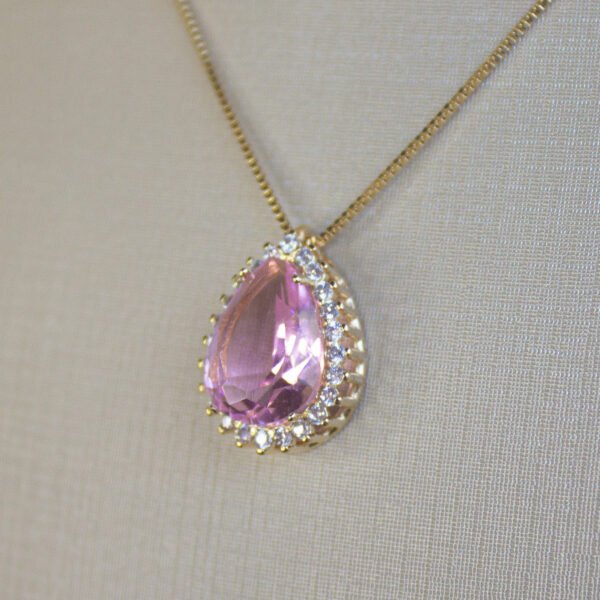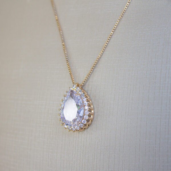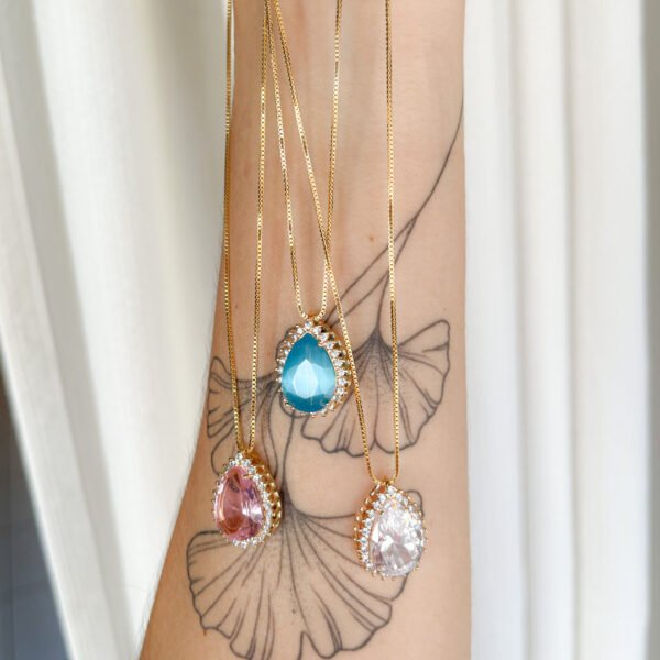 A gargantilha Pedra Color é uma peça elegante e sofisticada que apresenta um pingente em forma de gota com detalhes de micro zircônias cravejadas ao seu redor criando um efeito deslumbrante de brilho e luminosidade. É uma peça que chama a atenção e acrescenta um toque de elegância ao visual.