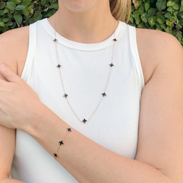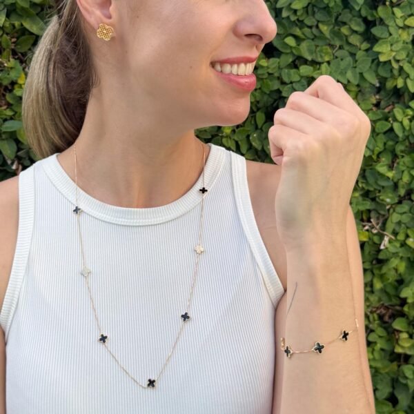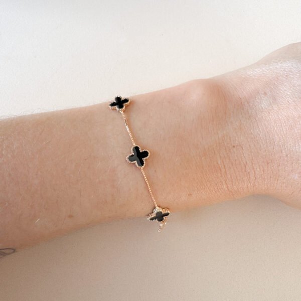 Essa Pulseira é mais do que um acessório; é um amuleto de sorte e estilo que transforma qualquer look em uma expressão de elegância e personalidade. Seus pingentes em formato de trevo de quatro folhas, com detalhes em dourado e um fundo preto intenso, fazem dessa peça uma verdadeira joia de presença sutil e sofisticada. Ideal para quem busca adicionar um toque de requinte e exclusividade ao visual, ela é perfeita para destacar seu brilho único em todas as ocasiões. Afinal, carregar um símbolo de sorte nunca foi tão bonito!